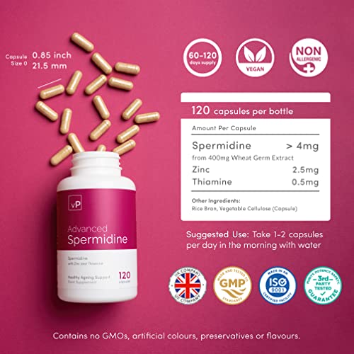 ✔ Suggested intake: Each capsule contains 4mg of Spermidine derived from 400mg of Wheat Germ Extract. For maximum benefits, we recommend taking 1-2 capsules per day, after a meal, with water. This dose is the equivalent of 4mg – 8mg of Spermidine. This Spermidine supplement is for adult-only use.
