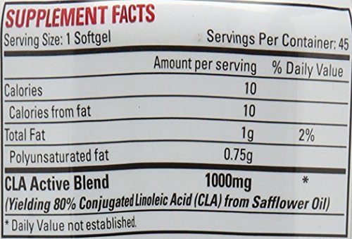Container Size: 180 Capsules Serving Size: 1 Capsule Servings Per Container: 180 Amount Per Serving: Total Calories: 10 Fat: 1g -Polyunsaturated Fat: 0.75g CLA Active Blend: 1000mg (Yielding 80% Conjugated Linoleic Acid (CLA) from Safflower Oil) Other Ingredients: Gelatine, Glycerine, Carob