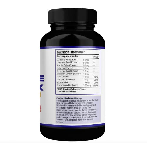 Caffeine, Guarana, Apple Cider Vinegar, Kelp Leaf, Cayenne Fruit Extract, Ginseg, Zinc, copper gluconate, B6, Chromium