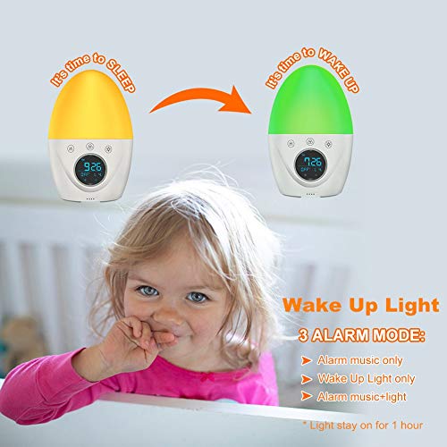 【HOW IT WORKS 】Set 2 separate alarms with your favorite color and sound, In the morning, it glows green green when its ok to come out of bed .During the night, light glows yellow and children know it’s time to sleep or stay in bed until light glows green ! 3 wake up modes ,you can set only use the light to wake up or both light and sound.
