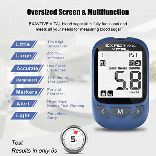 EXACTIVE Vital Blood Sugar Monitor, Diabetes Testing Kit with Hypo/Hyper Warning, Blood Glucose Meter with Log Book & 50…