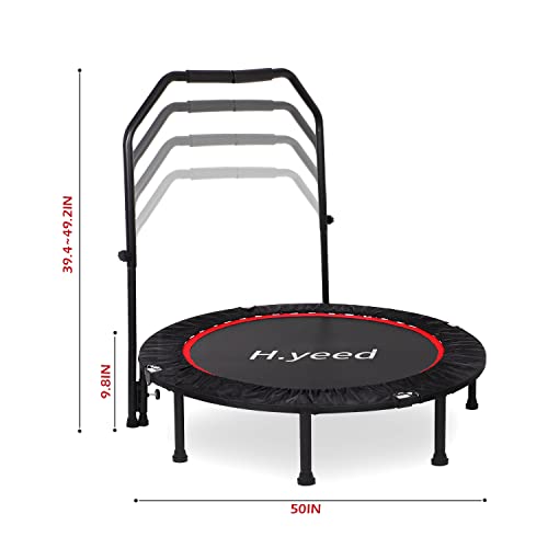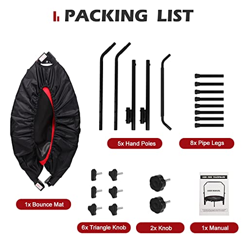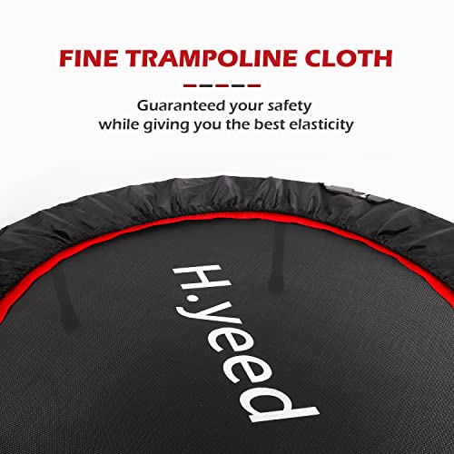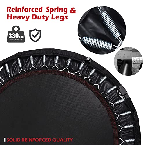 【Sturdy Construction】- This 50″ Fitness Trampoline is consist of thickened steel frame and tear-resistant PP bouncing mat secured with 40 steel springs to ensure stable, supports up to 100kg/220lbs. Suitable for both kids and adults jumping for a long time.
