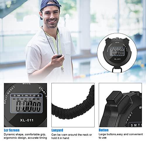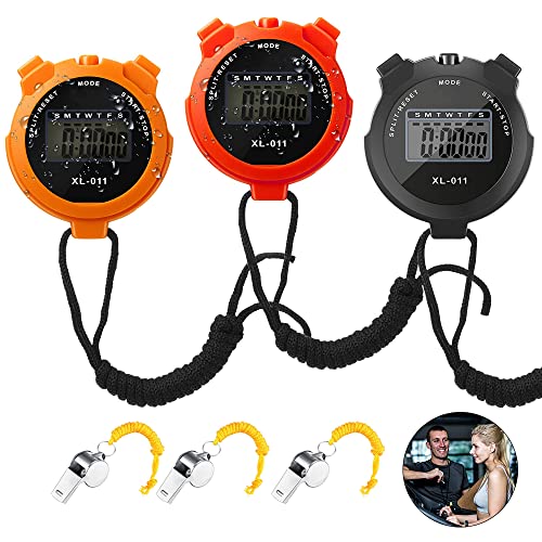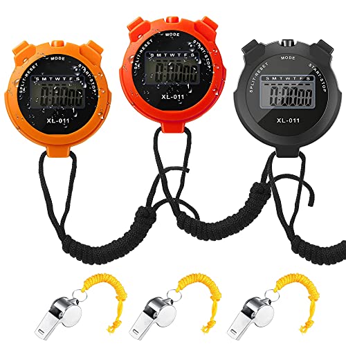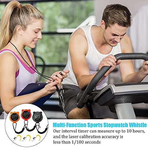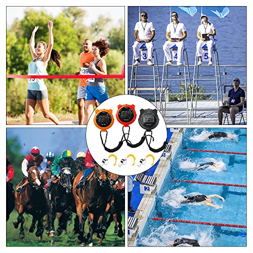 3 Stop Watches and Whistle – You will receive 3 stopwatch and 3 silver whistle, the stop watch has 3 different colors, black, red, orange, the color and quantity can definitely meet your needs, the large screen display ,Very convenient.