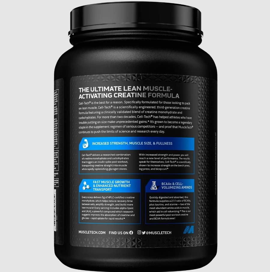 More muscle size and fullness: Cell-Tech delivers a multi-stage combination of carbohydrates that forces a powerful insulin spike post-workout. This helps shuttle creatine and other nutrients into the muscle and rapidly replenishes glycogen stores, facilitating glycogen supercompensation and an intense muscle-expanding effect.