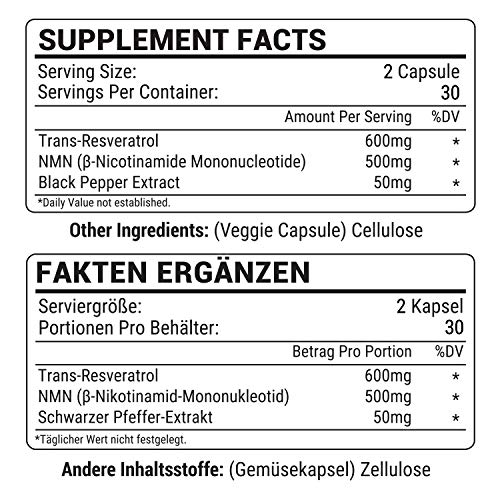 Trans-Resveratrol (600mg), NMN (B-Nicotinamide Mononucleotide) (500mg), Black Pepper Extract (50mg)