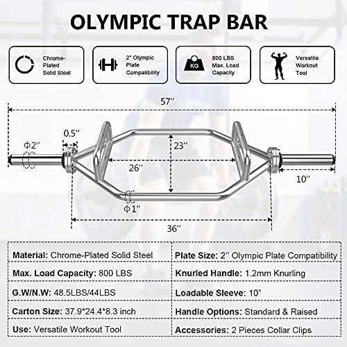 【HEAVY-DUTY SOLID STEEL CONSTRUCTION】 Dripex Olympic trap bar is constructed from heavy duty solid stainless steel with a maximum load of 800lbs. Chrome-plated surface is durable and rust-proof.