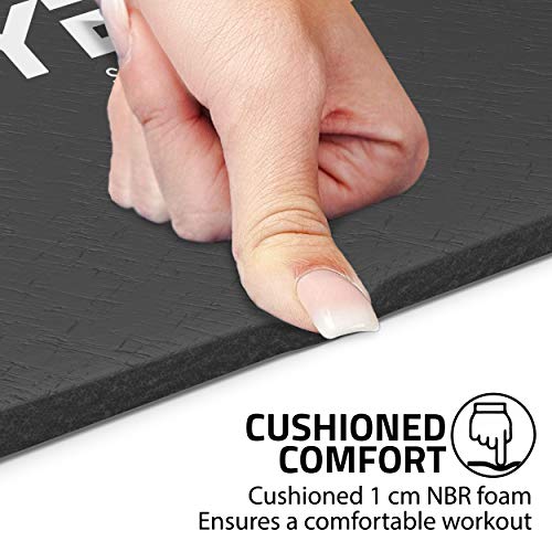 2- HIGH DENSITY NBR FOAM: The cushioned build of this 1 cm thick exercise mat ensures unparalleled comfort even during heavy-duty utilization; Protective on your spine, hips, knees and elbows to keep you balanced and prevents injuries on hard floors or grounds
